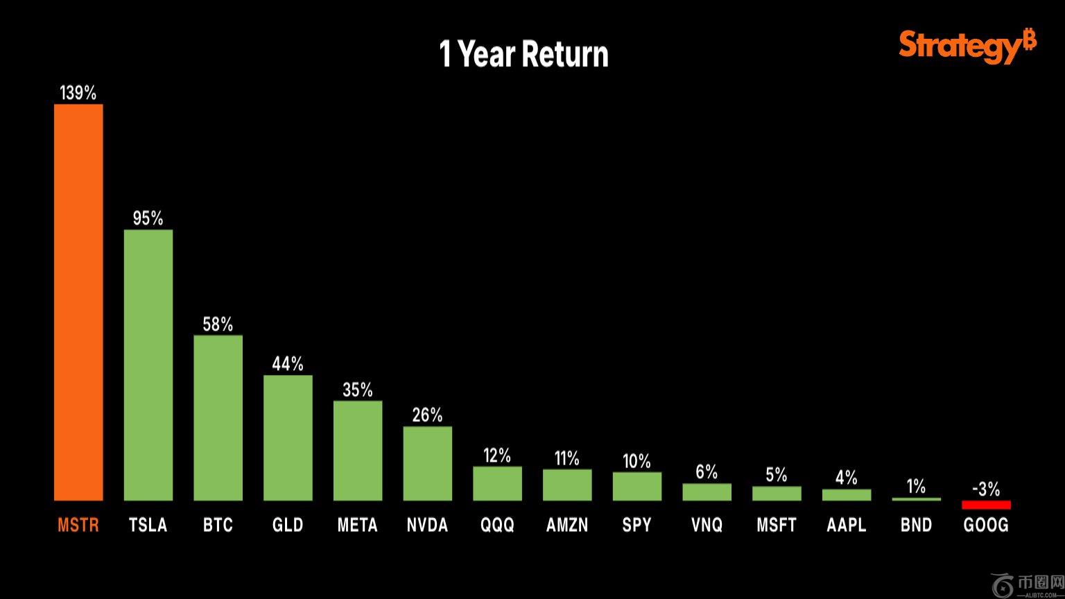 MSTR荣登一年期投资回报率排行榜榜首。资料