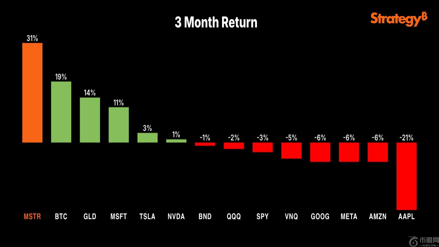 MSTR 领跑三个月投资回报率排行榜。