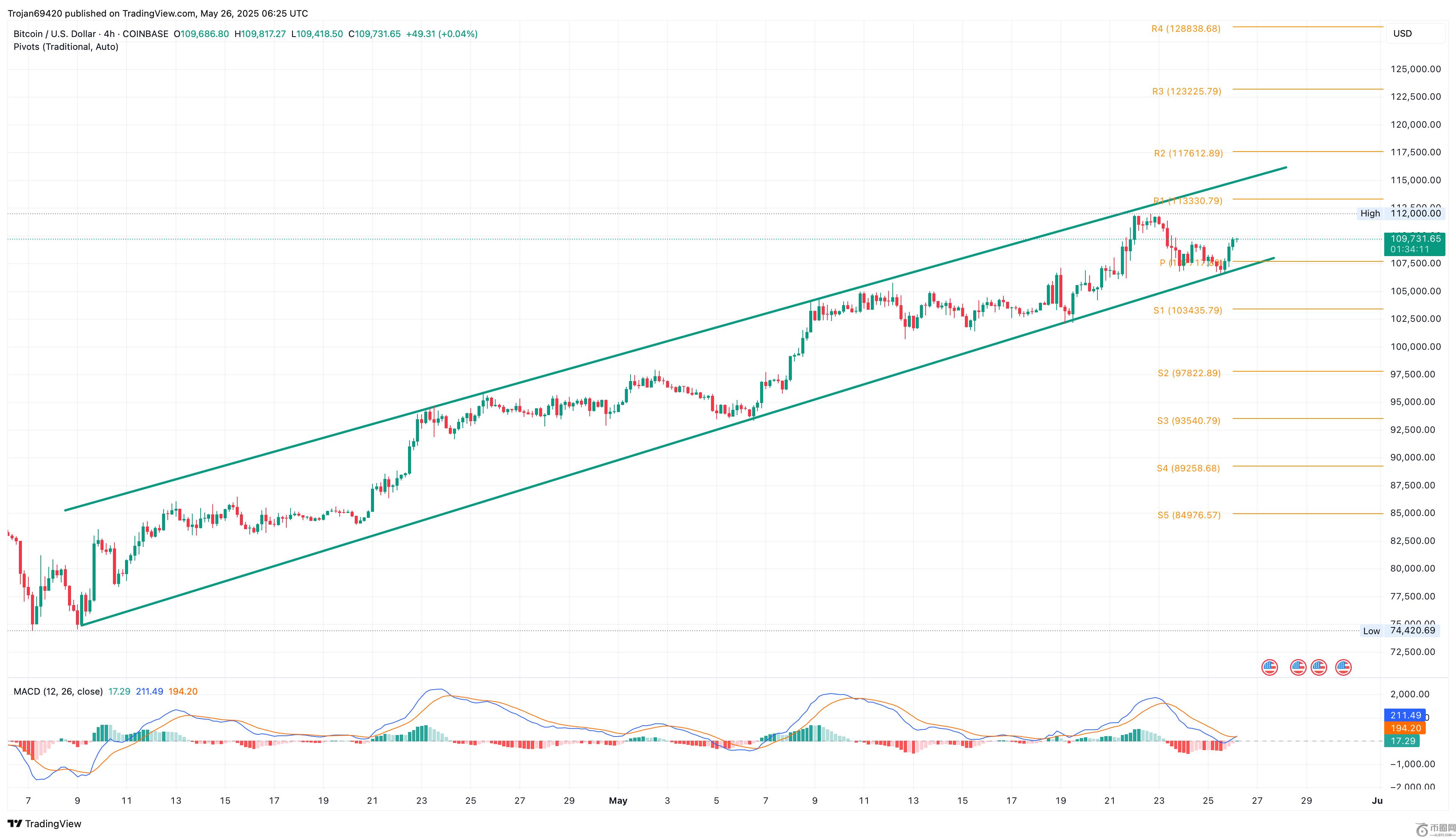 比特币目前交易价为109,615美元,正在从平行通道的支撑趋势线反弹。这表明看涨模式中出现了新的上行周期,并可能瞄准上方趋势线。