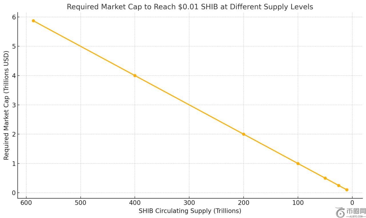 鉴于Shiba Inu的巨大供应量,如果其价格飙升至每枚**0.01美元,SHIB的市值将飙升至5.89万亿美元。这一估值超过了比特币目前的市值以及白银等其他主要资产。