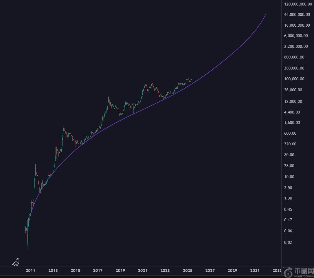 他 呈现比特币的对数价格图,涵盖从 2011 年到预计的 2031 年。该图具有弯曲的趋势线,捕捉了比特币的长期指数增长模式。