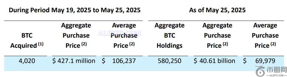 Strategy又以 4.271 亿美元的价格收购了 4,020 个 BTC,平均购买价格为每比特币106,237 美元。