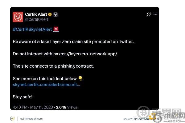 2023年7月,安全公司 CertiK 警告用户警惕假冒 LayerZero 的 X(前 Twitter)账号宣传的空投**。这些链接会将用户引导至一个与 LayerZero 官方网站极为相似的**页面。
