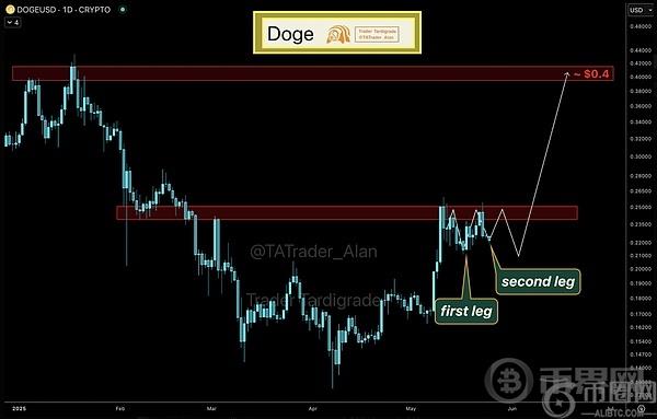具体来说,狗狗币的**波盘整发生在上周二,此前未能突破0.25美元的直接阻力位。交易员Tardigrade认为,狗狗币在跌破0.21美元并摆脱弱势后,很可能会突破这一水平。然而,这位专家指出,狗狗币在突破阻力位之前可能会多次触及阻力位。