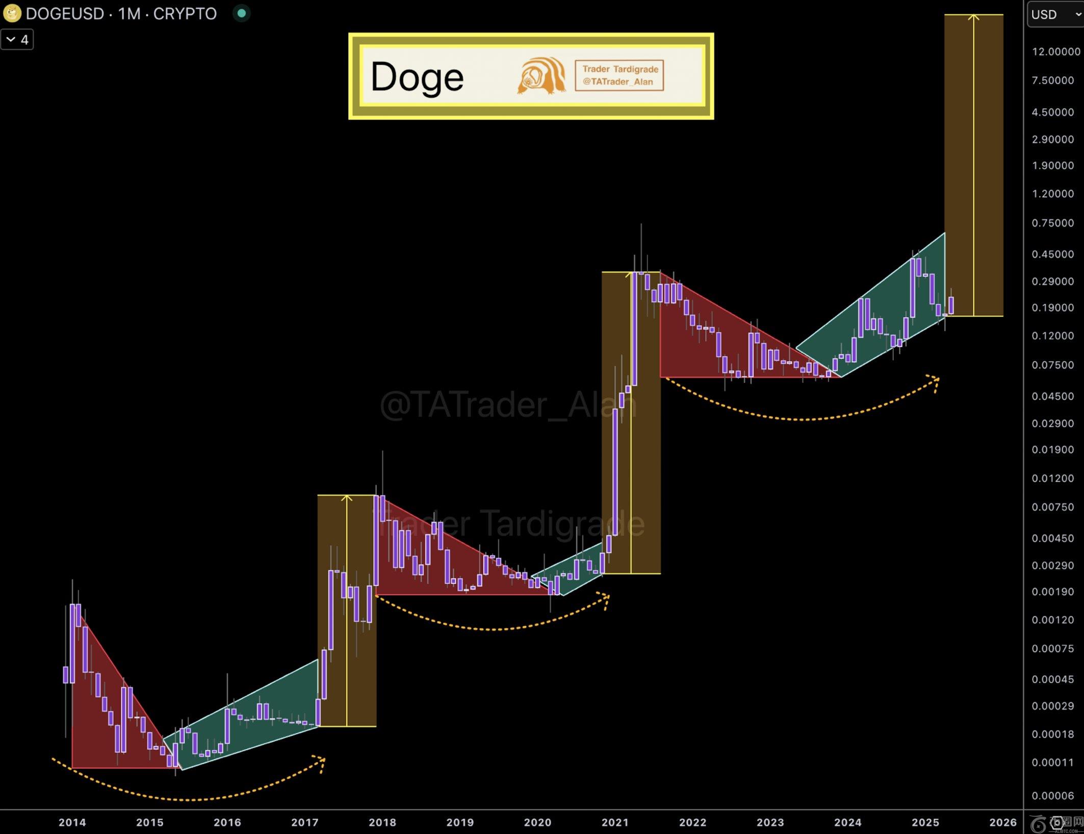 交易员Tardigrade指出,DOGE/USDT 1个月时间框架内出现了反复出现的看涨模式。X的分析强调,如果这一趋势得以实现,狗狗币的价格可能会达到前所未有的水平。