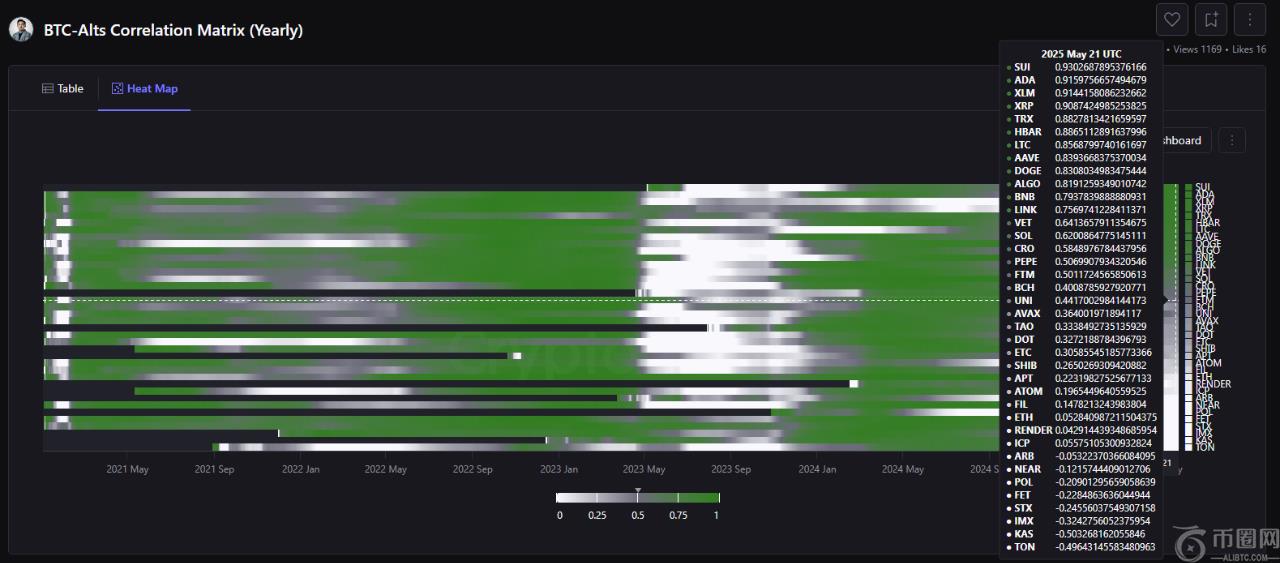 CryptoQuant 发布的一张热力图展示了 2021 年至 2025 年比特币与各种山寨币之间的逐年相关性得分。**数据清晰地表明,在当前牛市期间,这种相关性正在不断增强。截至 2025 年 5 月,SUI 的相关值达到 0.93,而 ADA 和 XLM 的相关值均达到 0.91。XRP、TRX、HBAR 和 LTC 的相关值均超过 0.88。