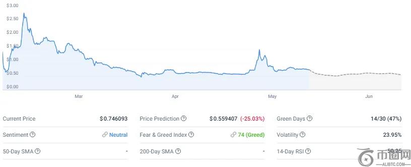 Pi 币价格预测模型显示,其前景相当悲观,因为在近期 Kraken Pro 期货上市后,该加密货币的交易价格为 0.746093 美元。技术分析表明,到 6 月 1 日,Pi 币可能跌至 0.573381 美元,较当前水平大幅下跌 22.95%。
