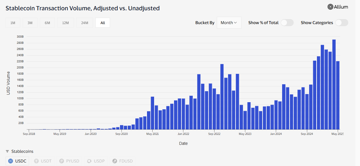 USDC 转账量在过去一年呈现增长趋势,已从 2023 年的熊市中复苏。|