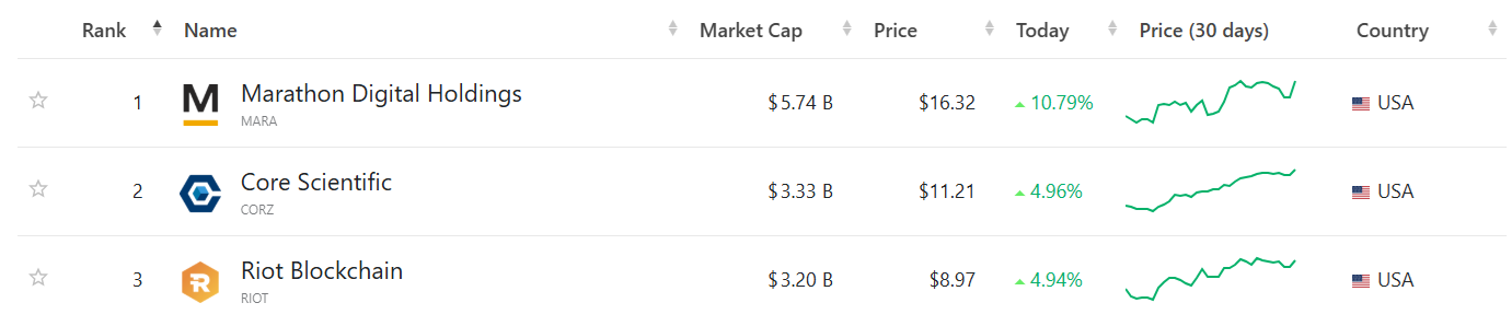 MARA 也创下了单日涨幅之最,尽管其他矿业公司股也表现强劲。大多数矿业公司股跟随比特币市场走势,过去一个月均实现净收益。