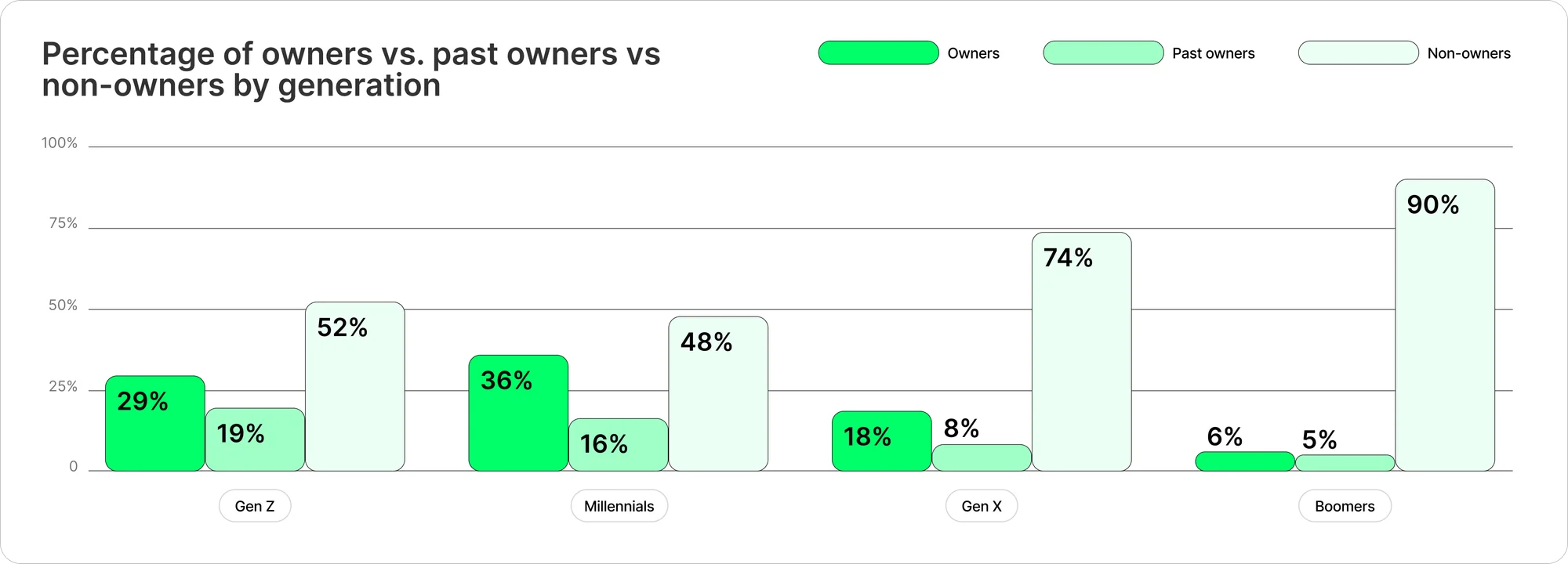 普遍的说法是,加密货币持有者大多是年轻人。这在很大程度上是事实。全球约有一半的千禧一代和Z世代受访者表示,他们目前持有或曾经持有加密货币,比例分别为52%和48%。这一比例显著高于全球总人口的35%。
