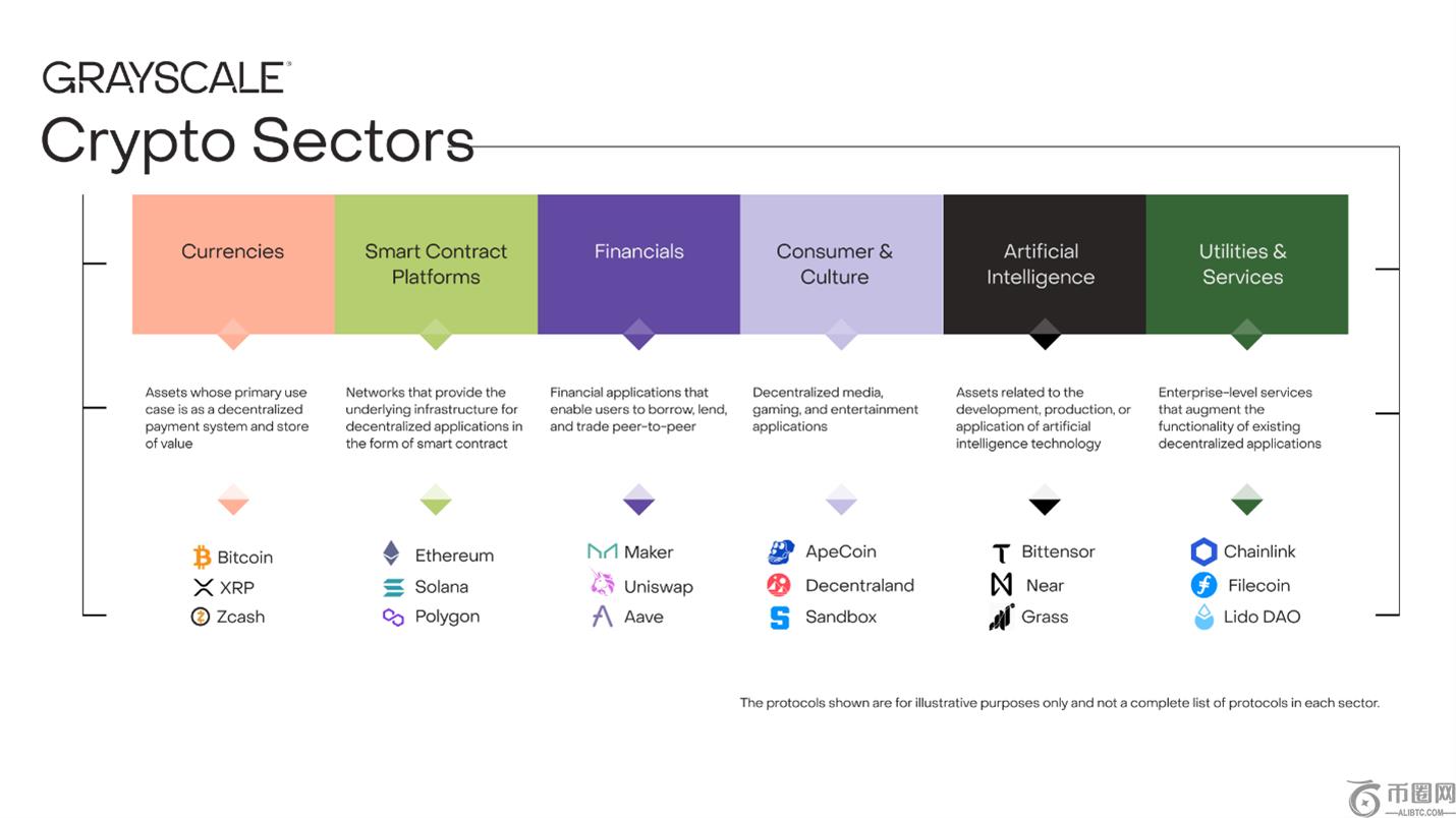 目前,Grayscale 将更广泛的加密市场分为六个不同的领域:货币、金融、智能合约平台、公用事业和服务、人工智能以及消费者和文化。