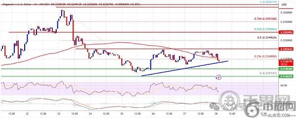 当前,狗狗币价格低于0.2350美元及100小时简单移动平均线。在DOGE/USD小时图上,出现了一条看涨趋势线,支撑位在0.2230美元。
