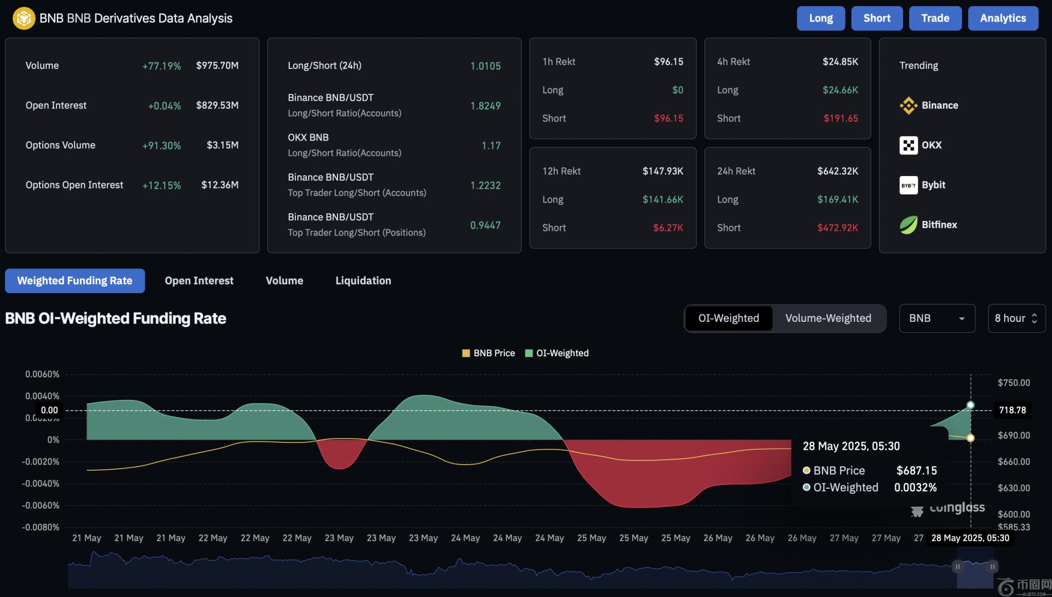尽管现货市场短期波动,BNB衍生品仍保持强劲看涨情绪。据Coinglass数据显示,未平仓合约保持稳定在8.2953亿美元,期权交易量则激增91.30%,达到315万美元。