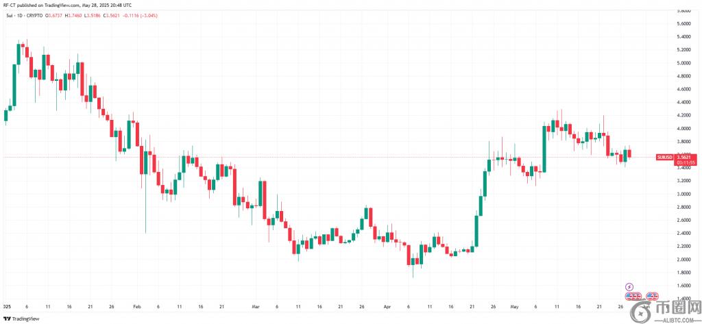 SUI 每日交易图表显示价格为 3.5621 美元,并附有技术分析模式 –