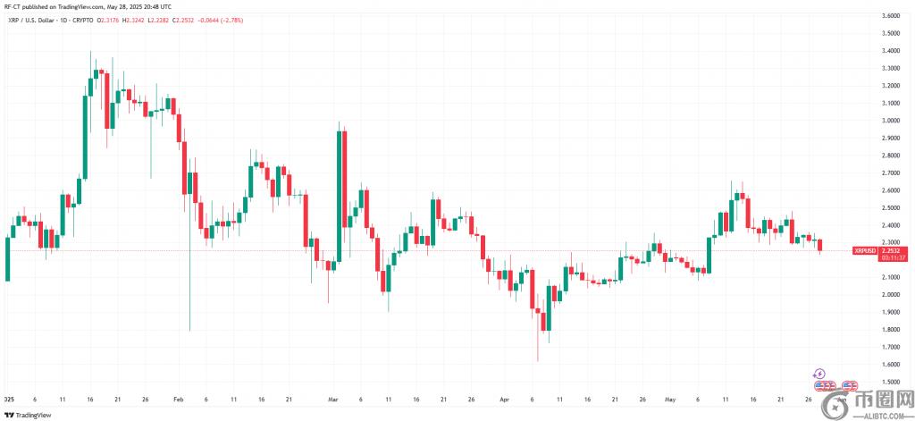 TradingView 上的 XRP 日线图显示,当前价格为 2.2532 美元,并附有技术分析模式 -