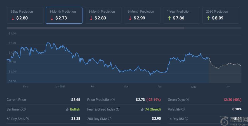 SUI 价格预测图显示,当前价格为 2.73 美元,预计 2021 年价格为 7.86 美元。