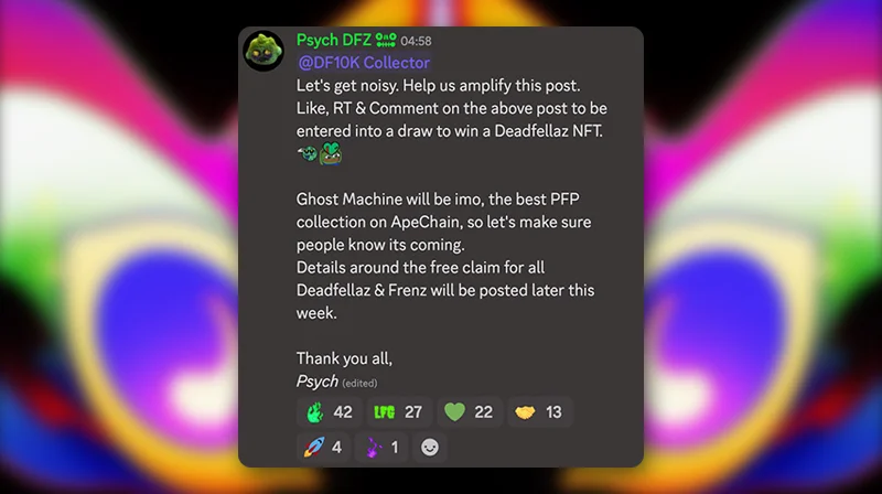 在 Discord 上向 Deadfellaz 持有者发布的公告中,Psych 解释说,在他看来,Ghost Machine 将是“ApeChain 上**的 PFP 系列”,Deadfellaz 社区成员对它的到来感到兴奋。