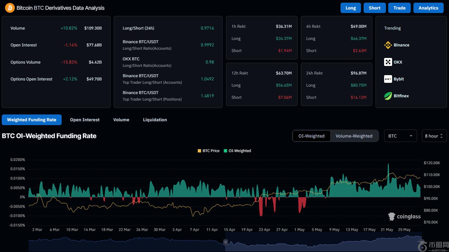BTC 持仓量加权资金利率图表显示,自 5 月初以来,资金利率大多为正值,其中零值上方的绿**域表示多头正在向空头支付。这通常意味着市场上杠杆多头仓位增多。