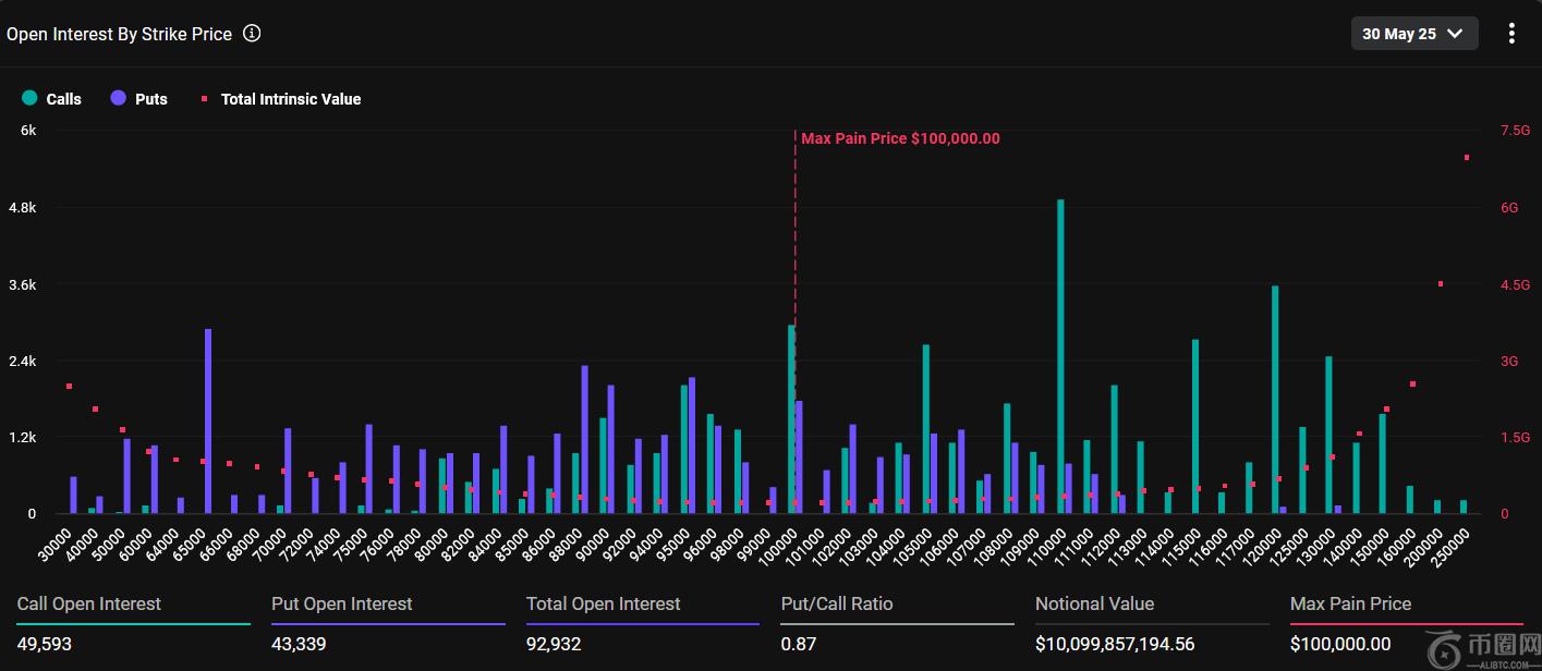该图表还显示,**痛苦价格约为10万美元,如果价格稳定在此水平,期权持有者可能会遭受**损失。做市商可能会将BTC推向这一水平,以**限度地减少损失。