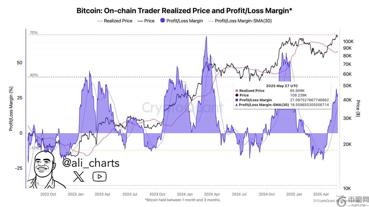 比特币交易员目前的平均利润率为 27%。从历史上看,一旦利润超过 40%,情况就开始见顶。