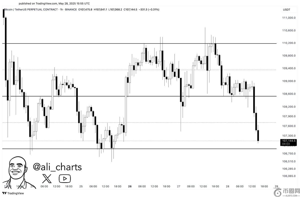 在新帖子中,加密货币交易员 Ali Martinez告诉他在社交媒体平台 十 上的 138,700 名粉丝表示,如果比特币跌破小时图上交易区间的下限 106,800 美元,则可能出现深度回调。