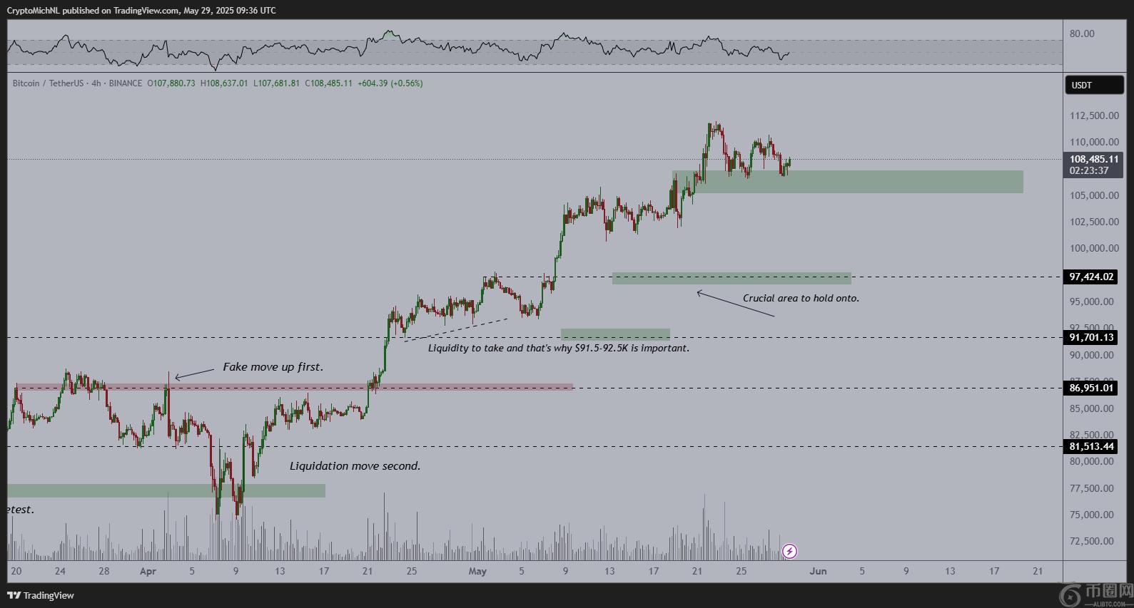 接下来是加密货币**,分析师说他**相信BTC将**上涨至历史新高(ATH)。然而,他指出,如果BTC失去10.7万美元的支撑位,可能会出现大幅回调。