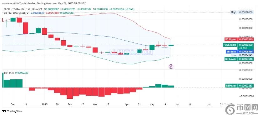 此外,TradingView 的周线图显示,FLOKI在经历了 2024 年末至 2025 年初的长期下跌趋势后,正试图实现技术反转。近期周收盘价为 0.00010390 美元,位于布林带中轨上方(基准价为 0.00008539 美元),并接近布林带上轨 0.00013560 美元。这一转变预示着看涨压力的上升,并与近期观察到的市场情绪改善相一致。