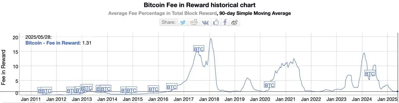 这意味着多年来费用仅占矿工收入的 1% 左右,一旦 2100 万 BTC 被开采完毕,比特币矿工的收入可能会下降 100%。