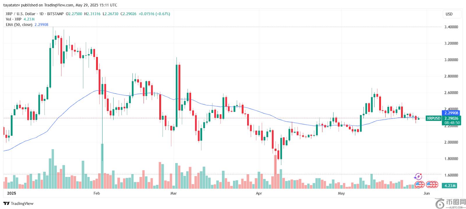 XRP/USDT 4 小时价格图(包含 RSI 和 50 EMA)。资料