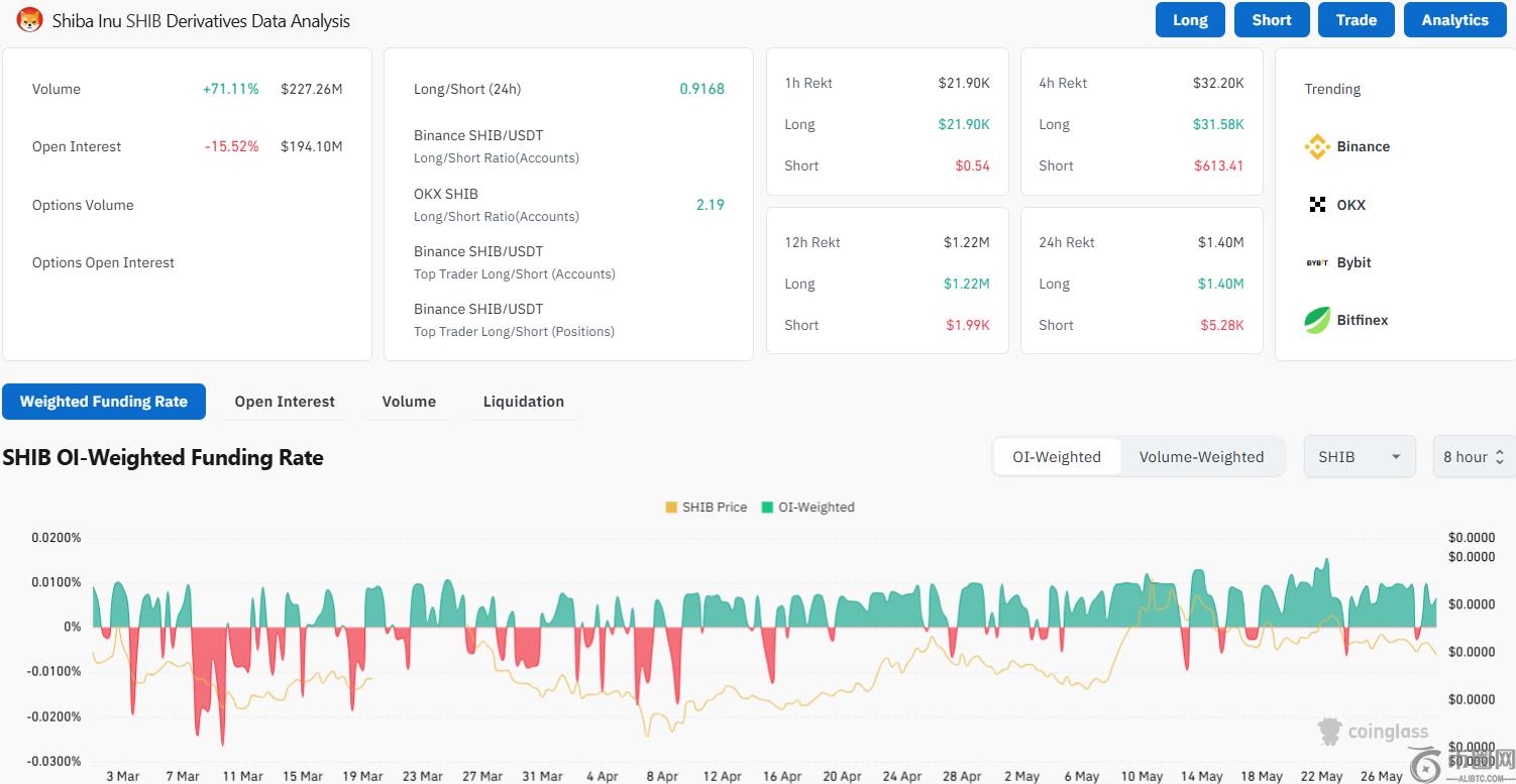 Shiba Inu 衍生品数据显示,价格波动期间交易活动出现显著变化。交易量激增 71.11%,达到 2.2726 亿美元,表明市场兴趣日益浓厚。