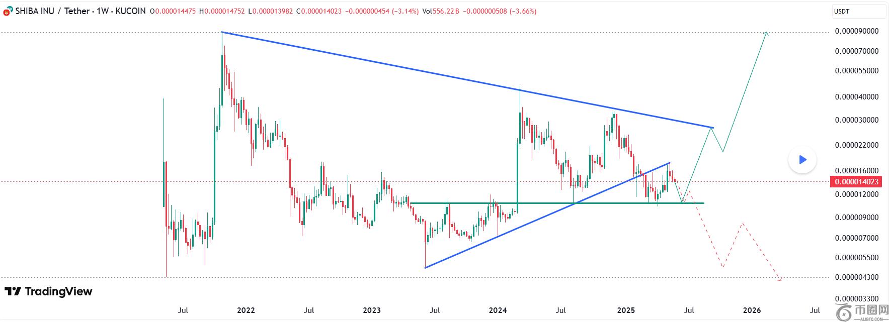 分析师概述了两种可能的未来走势:看涨情景和看跌情景。看涨预测假设SHIB将成功守住0.0000108美元的支撑位,出现反弹,并**突破长期下行阻力线。