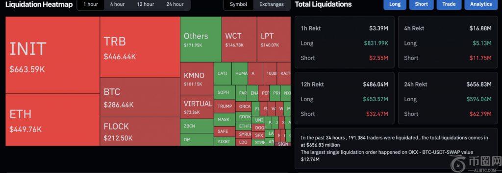 DOGE 和其他资产在过去 24 小时内遭遇了大规模清算。据CoinGlass数据显示,加密货币市场在过去一天的清算金额为 6.5684 亿美元。