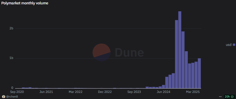 文章标题:Polymarket 5 月份月交易量回升至 10 亿美元