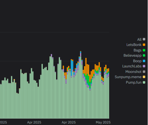 尽管最初的 Launchpad 仍占据主导地位,但新平台仍在与 Pump.fun 竞争。|
