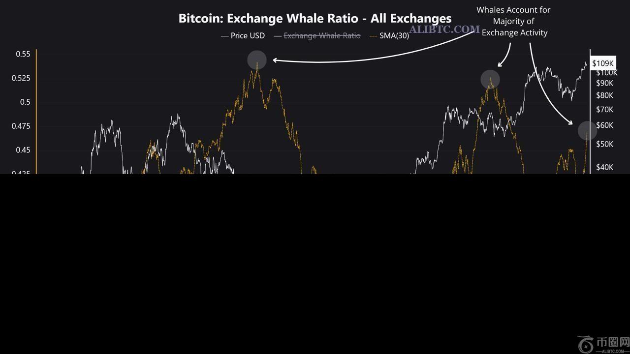 CryptoQuant 的数据显示,交易所鲸鱼比例急剧上升,建议谨慎行事。从历史上看,当该比率超过 0.5 时(表明鲸鱼占据了交易所流入的大部分),价格顶部通常随之而来。