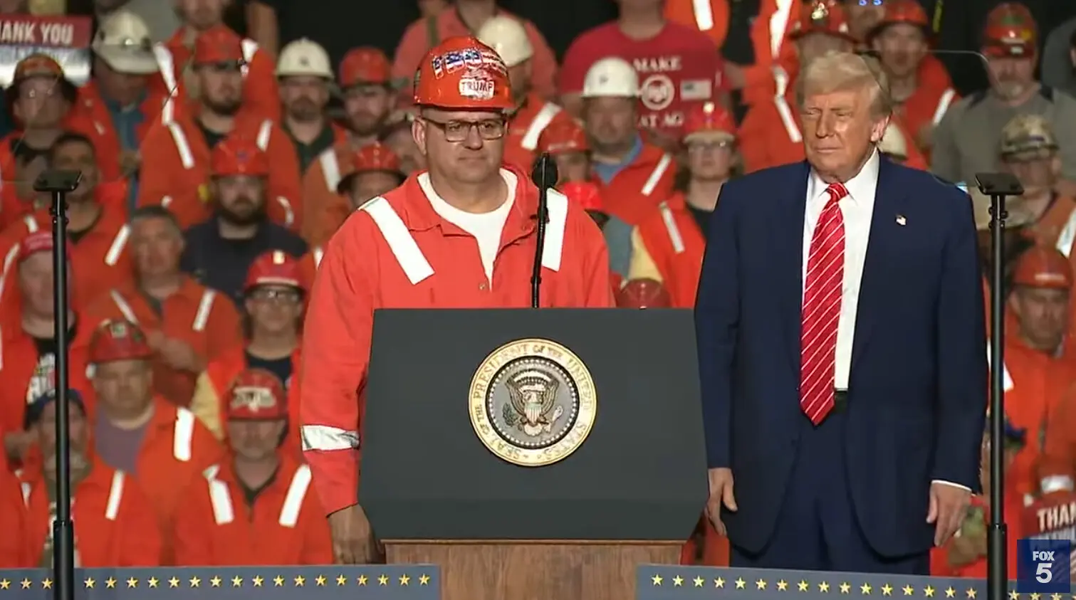 特朗普**表示,随着关税上调和新日铁协议的达成,美国钢铁工人有很多值得庆祝的事情。他邀请几名员工上台,他们谈到了该行业面临的挑战。他们感谢他的行动。