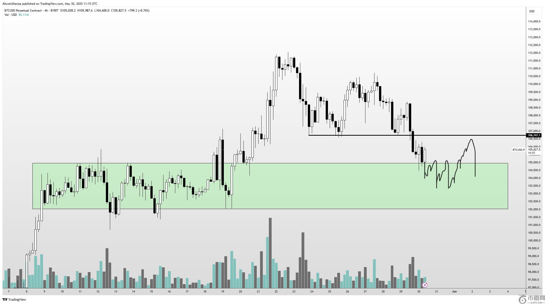 基于在 Sherpa 的四小时时间范围内的图表上,比特币可能会跌至略高于 103,000 美元,然后在盘整区域横盘交易一段时间。