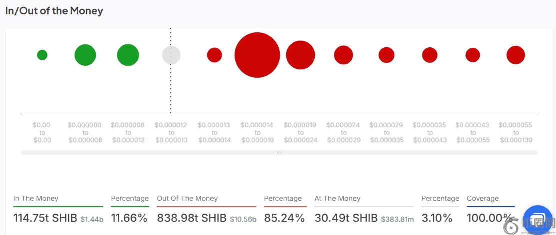 根据 IntoTheBlock 的数据,在**一轮崩盘之后,损失方的钱包数量已增至约 123 万个,占 Shiba Inu 144 万个链上地址的 85.24%。这些地址共持有 838.98 万亿枚 SHIB **。