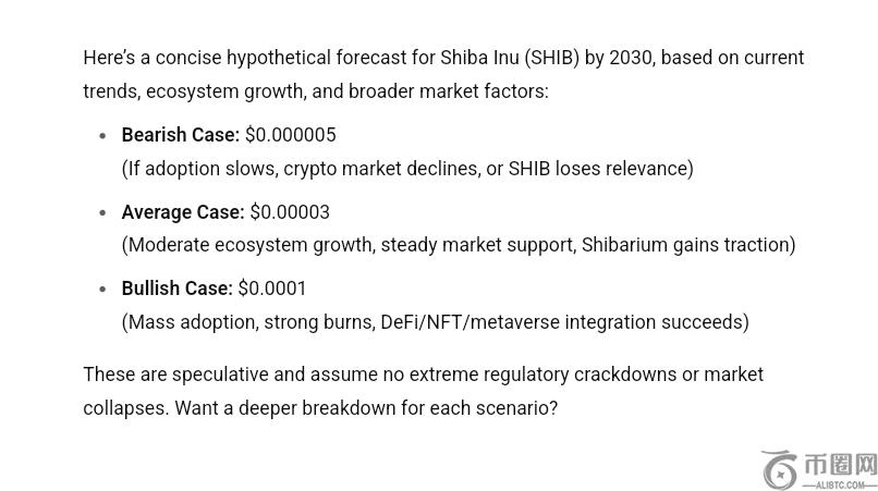 此外,我们之前曾咨询过人工智能模型 ChatGPT,以确定 SHIB 在 2030 年的价格。然而,该聊天机器人对 SHIB 在 2030 年的预测并不像其他机构发布的预测那样乐观。根据 ChatGPT 的预测,到 2030 年,柴犬的交易价格可能为 0.000005 美元,平均价格为 0.00003 美元,或为 0.0001 美元的看涨目标。