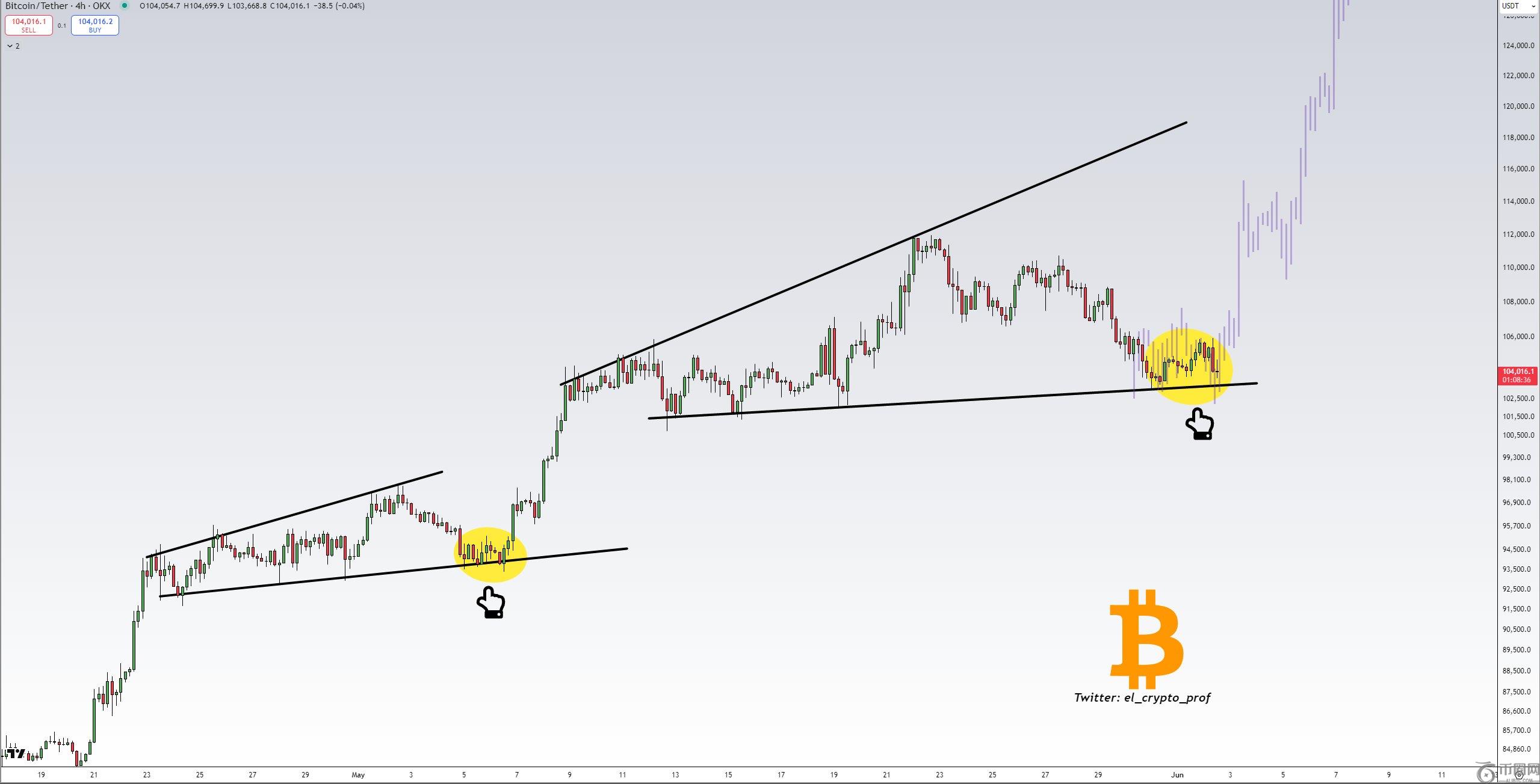 分析师 Moustache 指出,**可能会出现小幅下跌,并确定 102,000 美元为**切入点,97,000 美元为必须守住的关键水平。