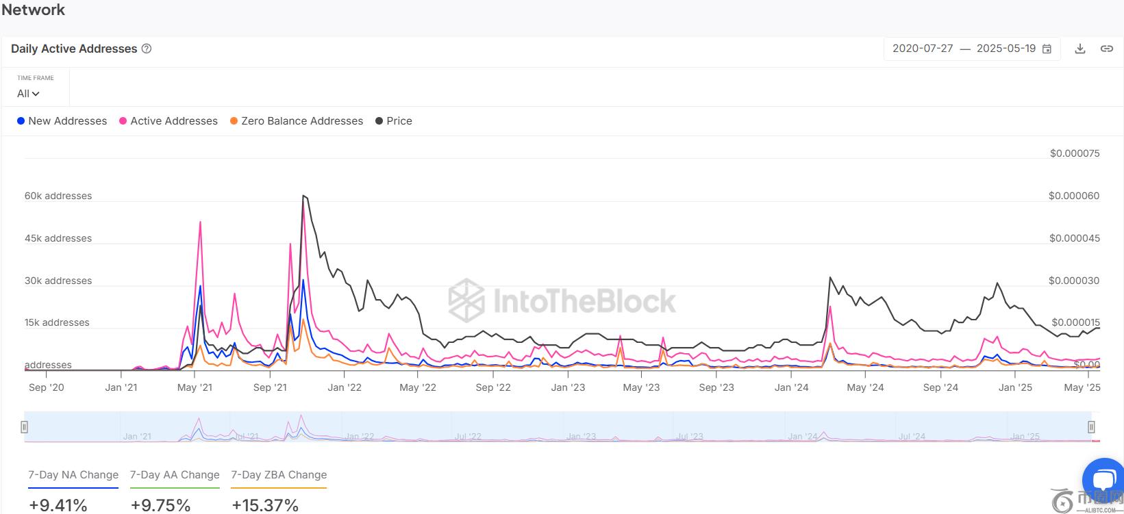 为了支持这一技术结构,IntoTheBlock 的**链上数据显示,SHIB 周围的网络活动日益活跃。从 2025 年初到年中,三个关键指标均有所增长。