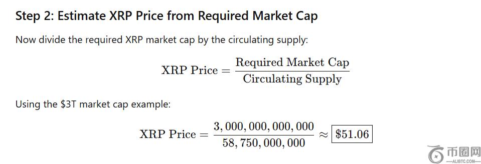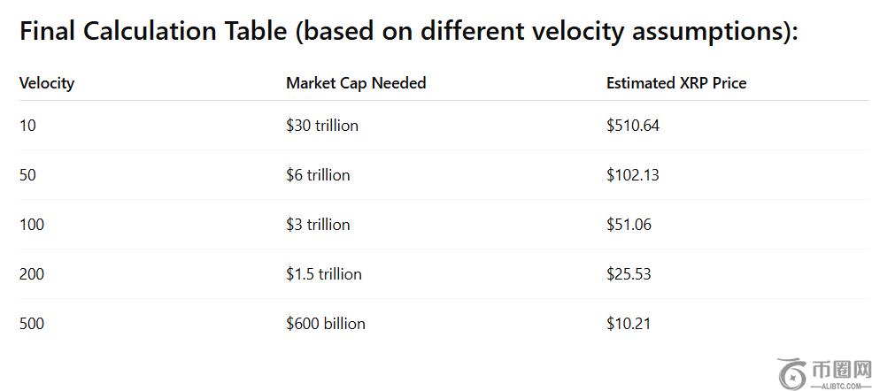 本质上,为了估算 XRP 的潜在价值,ChatGPT 首先研究了每年处理 300 万亿美元所需的 XRP 数量。他们使用了一个简单的公式:总交易量除以流通速度。例如,如果每个 XRP **曾是每年重复使用 100 次,网络只需要价值 3 万亿美元的 XRP 即可处理** 300 万亿美元。