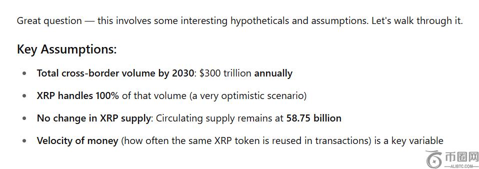 加密基础知识试图确定这种增长对XRP的价格因此,我们向 ChatGPT 提出了一个假设性问题:如果到 2030 年,XRP 处理所有 300 万亿美元的年度跨境支付,会怎样?这会导致什么样的价格?