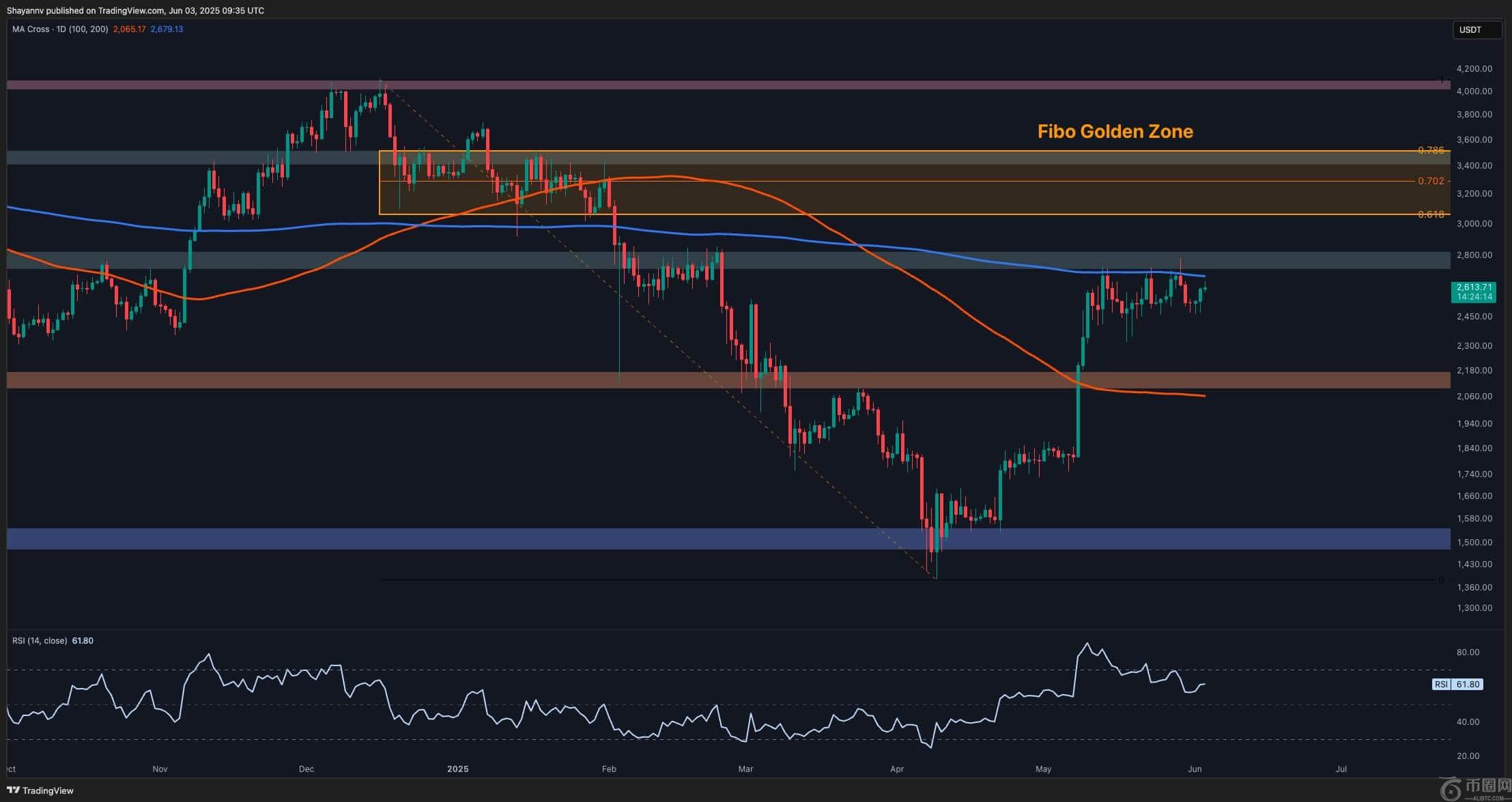 当前的市场结构类似于上升通道或潜在的分布区间。如果比特币价格**突破 2,850 美元,则可能打开通往 3,000-3,200 美元区域的道路,这与斐波那契黄金区间一致;而如果比特币价格跌破 2,400 美元,则可能使市场动能重新转向卖方,目标价位为 2,100 美元。