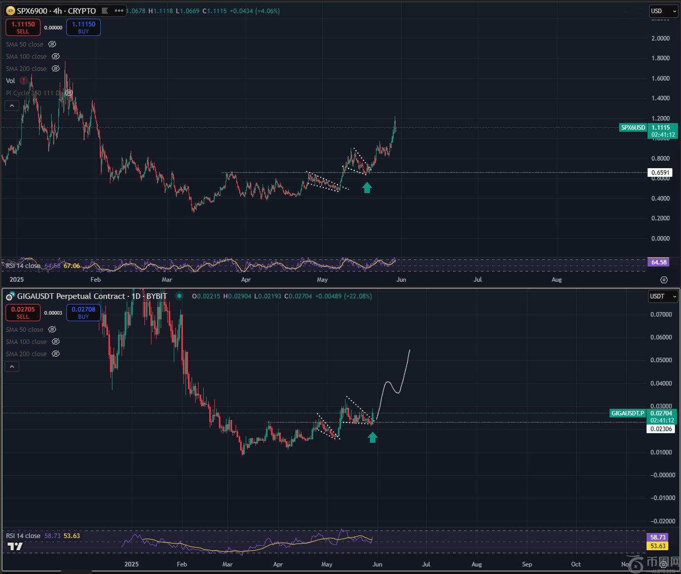 交易者关注的**一种货币是 Gigachad(千兆),一种基于 Solana 区块链构建的 memecoin。Bluntz说GIGA 似乎正在追随 memecoin SPX6900 的脚步(SPX),这种山寨币自 3 月份触底以来已上涨约 360%。