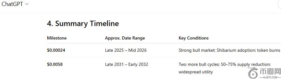 据 ChatGPT 称,柴犬的价格将在 2025 年末至 2026 年中期达到 0.00024 美元的里程碑,这可能是受到强劲牛市、SHIB **销毁以及 Shibarium 广泛采用的推动。