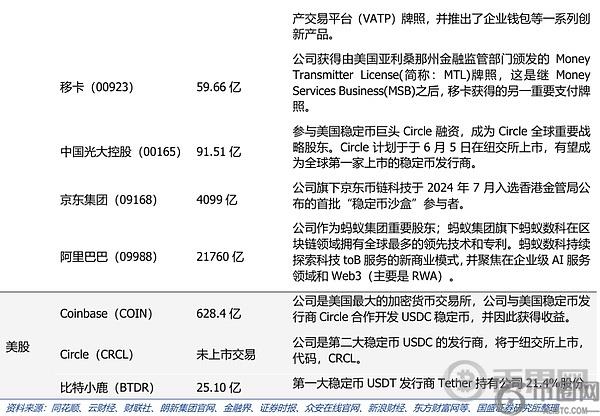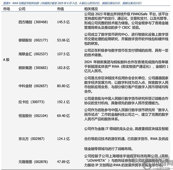 RWA与稳定币的快速发展推动了监管的跟进。5月20日《引导和建立美国稳定币**创新法案》(GENIUS法案)通过了美国参议院的程序性投票,标志着该法案在参议院取得了重要进展;后续,法案将进入参议院全体表决阶段。5月21日,**香港立**通过《稳定币条例草案》,在**香港设立法币稳定币发行人的发牌制度,完善对虚拟资产活动的监管框架。无论是美国市场,还是**香港市场,监管对稳定币法案的积极推动的背后力量都离不开稳定币和RWA市场的快速发展。此前,**香港金管局已公开首批稳定币发行人沙盒名单,包括京东集团旗下京东币链科技(香港)、圆币创新科技以及来自渣打银行(香港)、安拟集团(Animoca Brands Limited)、香港电讯(HKT)三家联合申请。