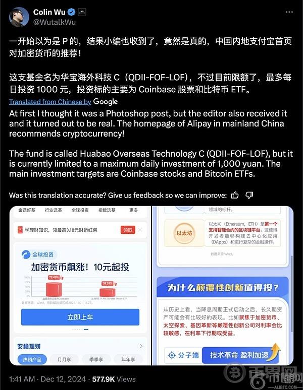 例如,**华宝基金管理有限公司旗下的“华宝海外科技 C(QDII-FOF-LOF)”基金在2024 年 12 月通过支付宝平台进行了广告宣传,强调其对 Coinbase 和 ARK 21Shares 比特币 ETF 的间接投资。该基金允许用户每日最多购买1000元人民币,**投资额为10元人民币。这一举措表明,尽管**大陆对加密资产持谨慎态度,但通过合规渠道,投资者仍可间接参与全球加密资产市场。