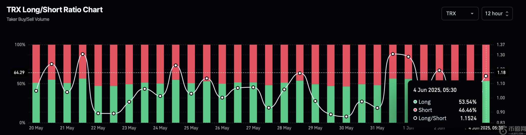 在过去的12个小时里,衍生品市场的TRX交易员们的乐观情绪有所升温。据Coinglass的数据,以交易量衡量,多空仓比达到了53.54%,整体仓位比达到了1.1524。