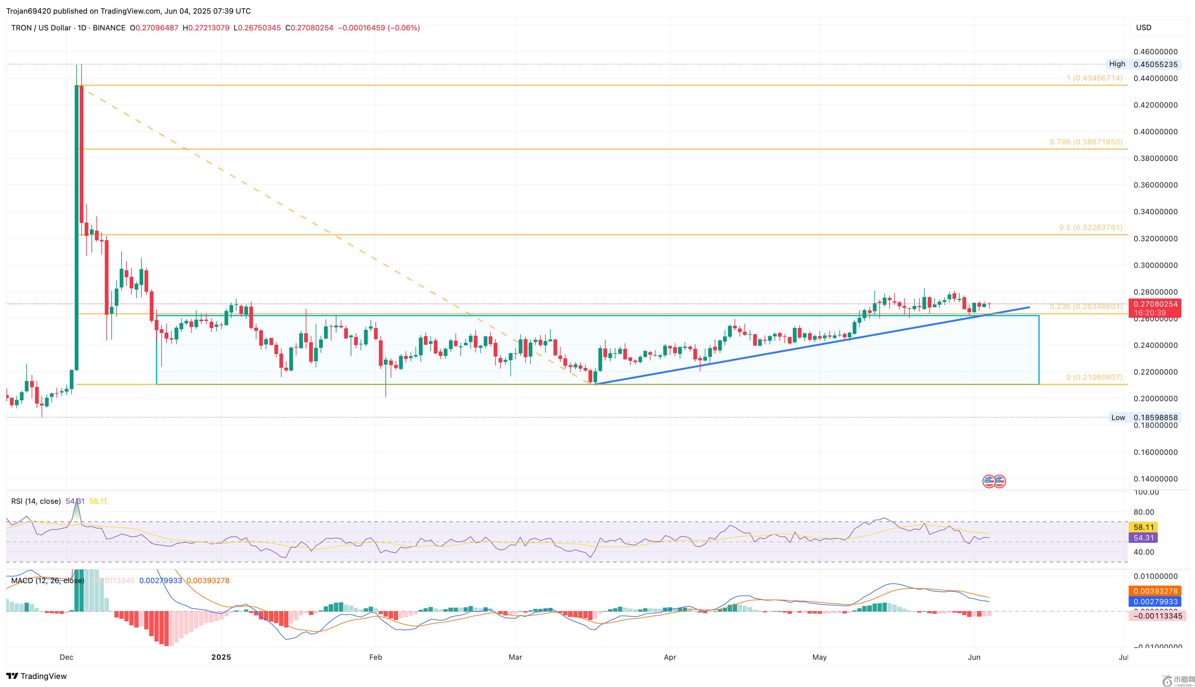 这一盘整阶段持续了近六个月。尽管突破了阻力位,TRX仍徘徊在区间上沿上方,难以果断突破0.2806美元的阻力位。